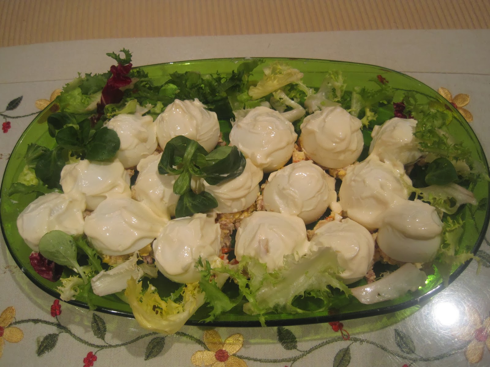 Se les da la vuelta con cuidado y se cubren con una masa, previamente batida en batidora, compuesta por: Mahonesa, atún y huevo duro.