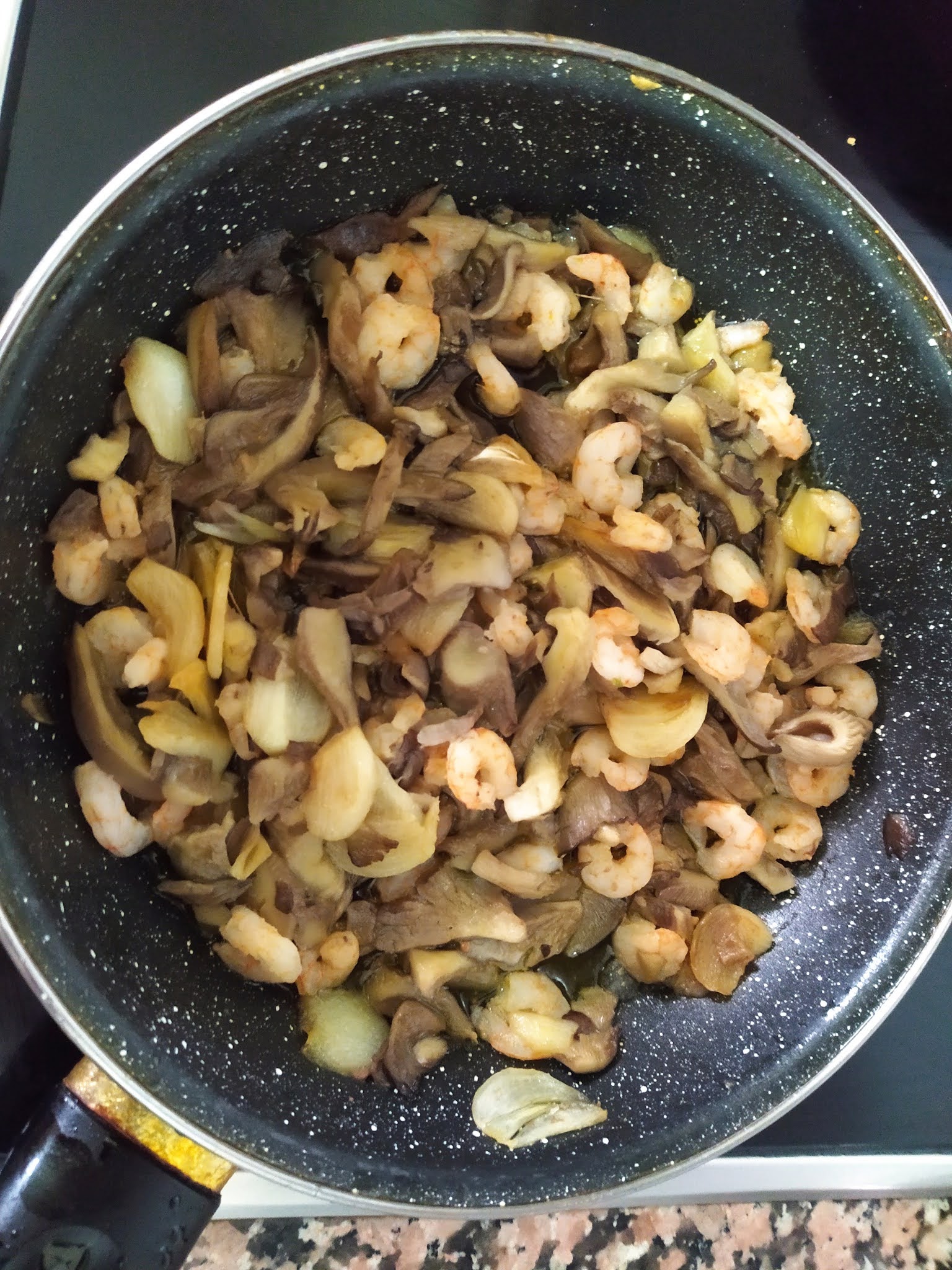 Es como hacer gambas al ajillo, añadirle setas y revolver todo con huevo. Así de sencillo. ¡Espero que os guste!